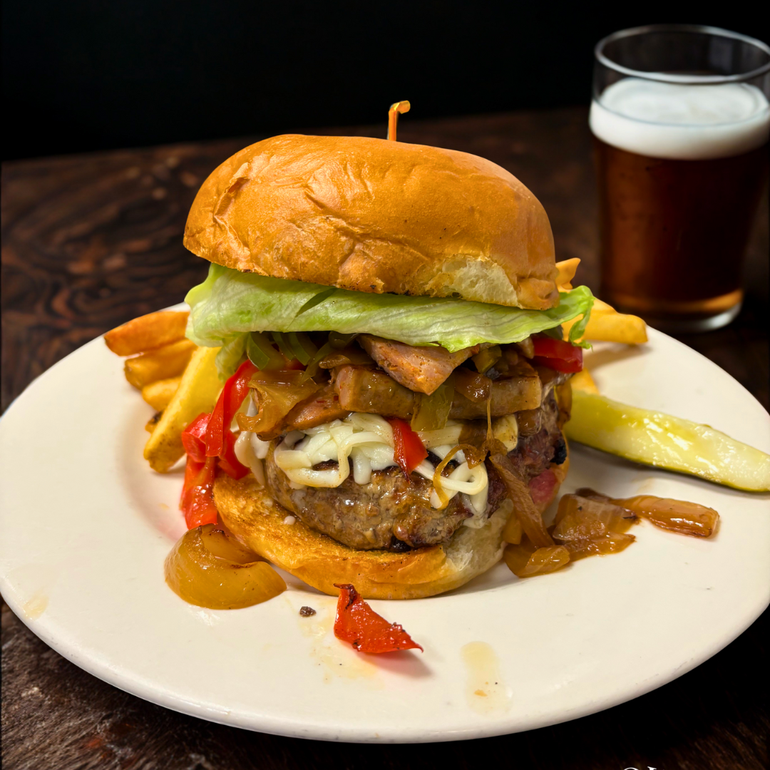 Juicy, 1/2 lb burgers! Pictured here -our North End Burger with sausage, peppers & onions.