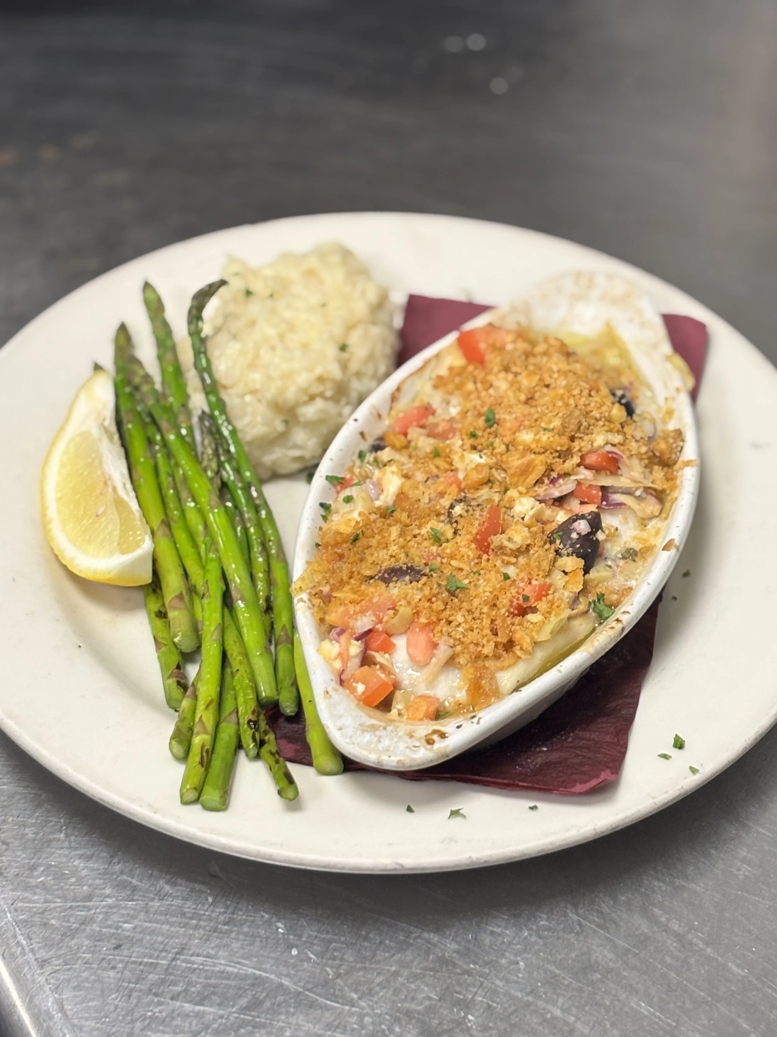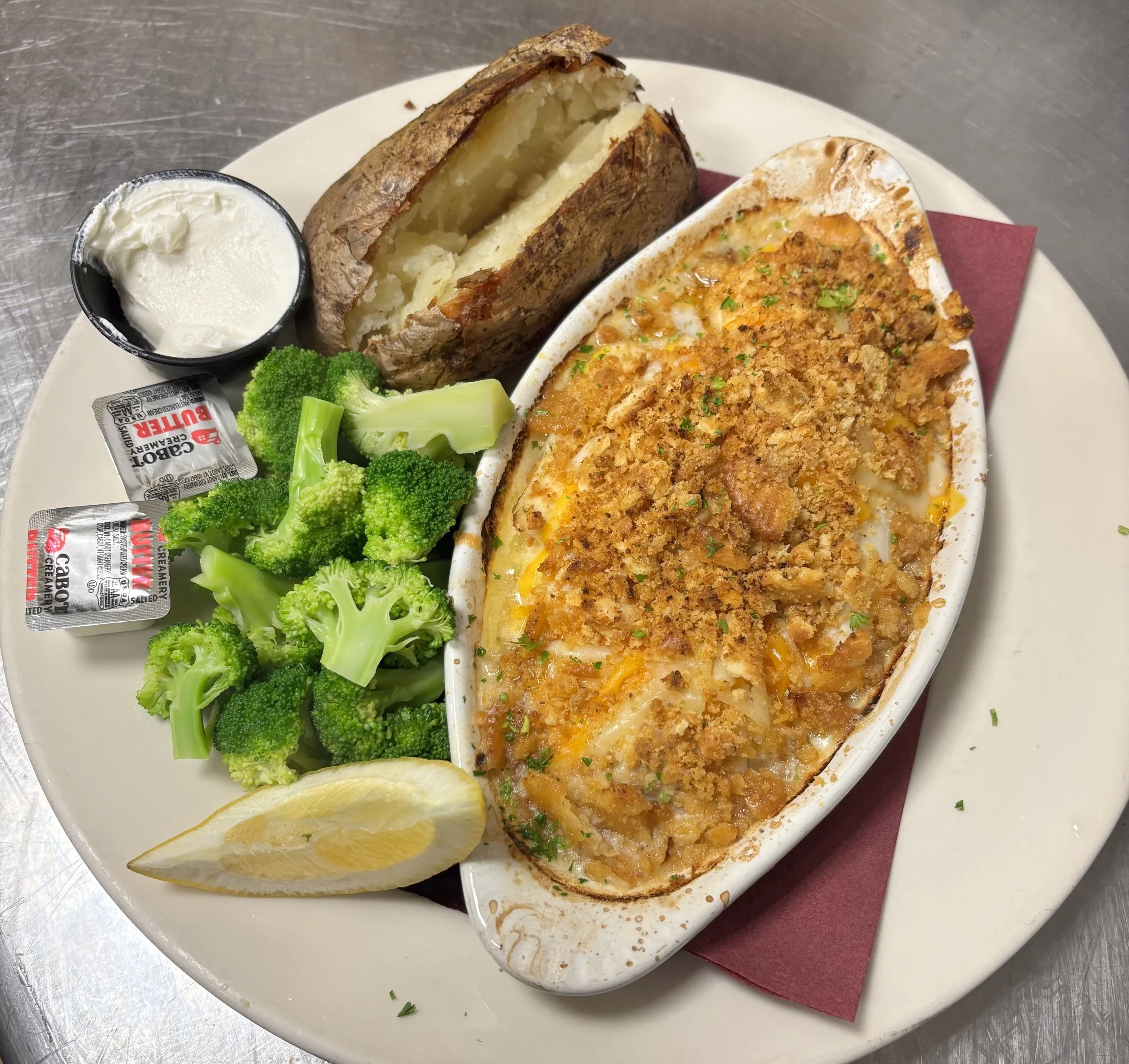 Classic haddock fillet casserole topped with seasoned crumbs and baked in a lemon, butter, white wine sauce. Served with choice of potato or wild rice and vegetable of the day. $27