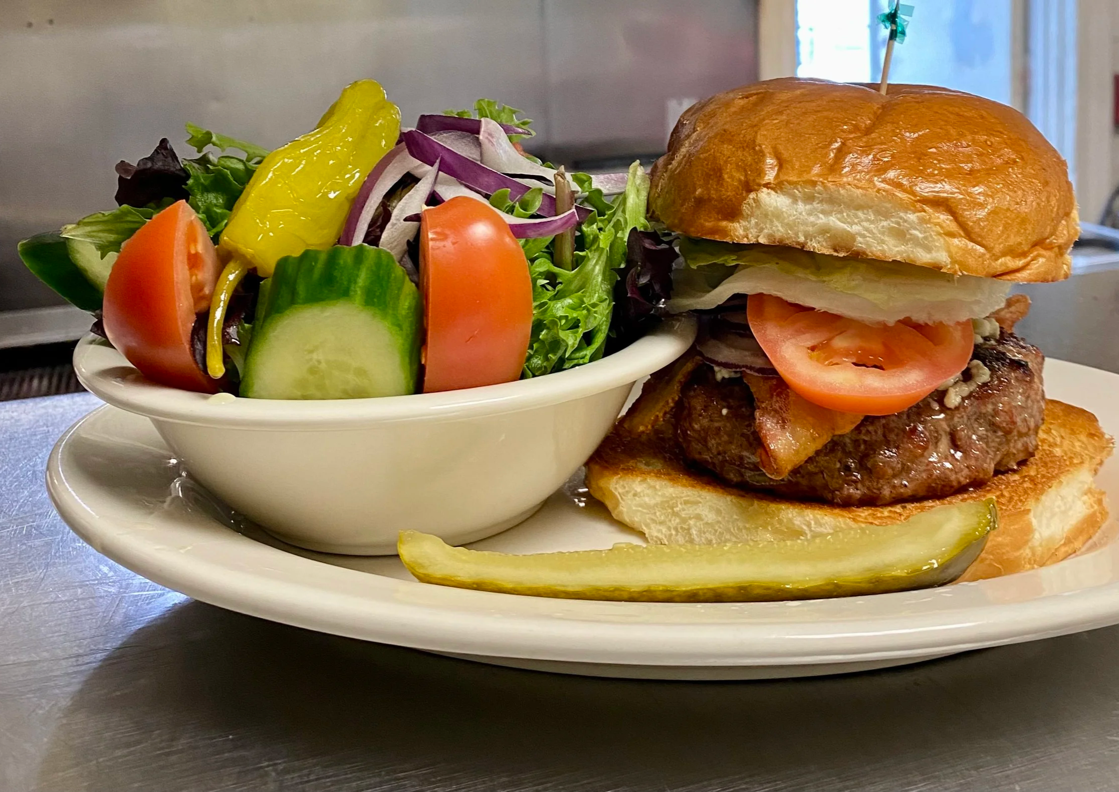 Our half pound burger topped with bacon, melted blue cheese, lettuce, tomato and onion. $16