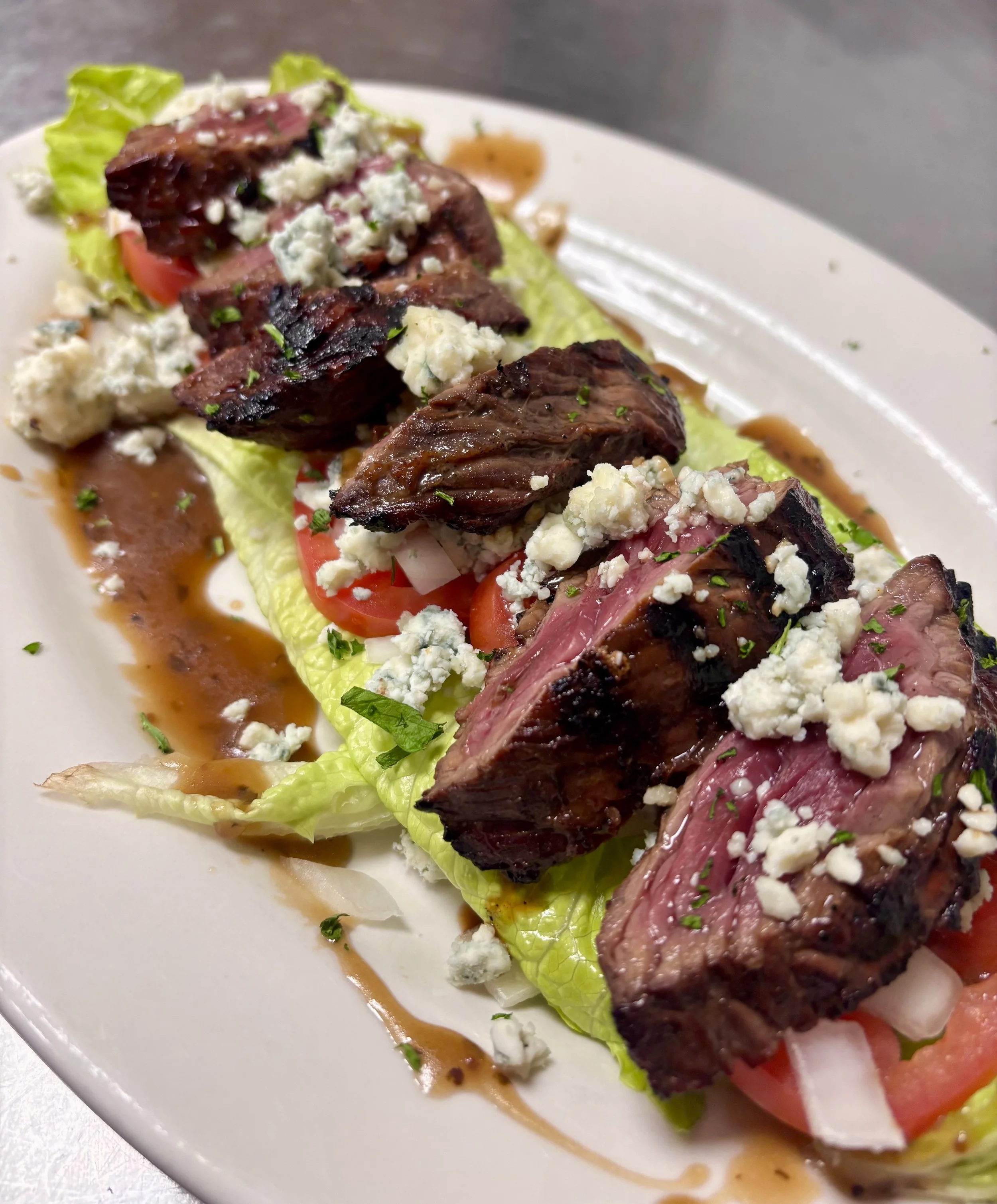 Iceberg lettuce wedge with our bleu cheese dressing, tomatoes, chopped bacon and balsamic reduction. $11