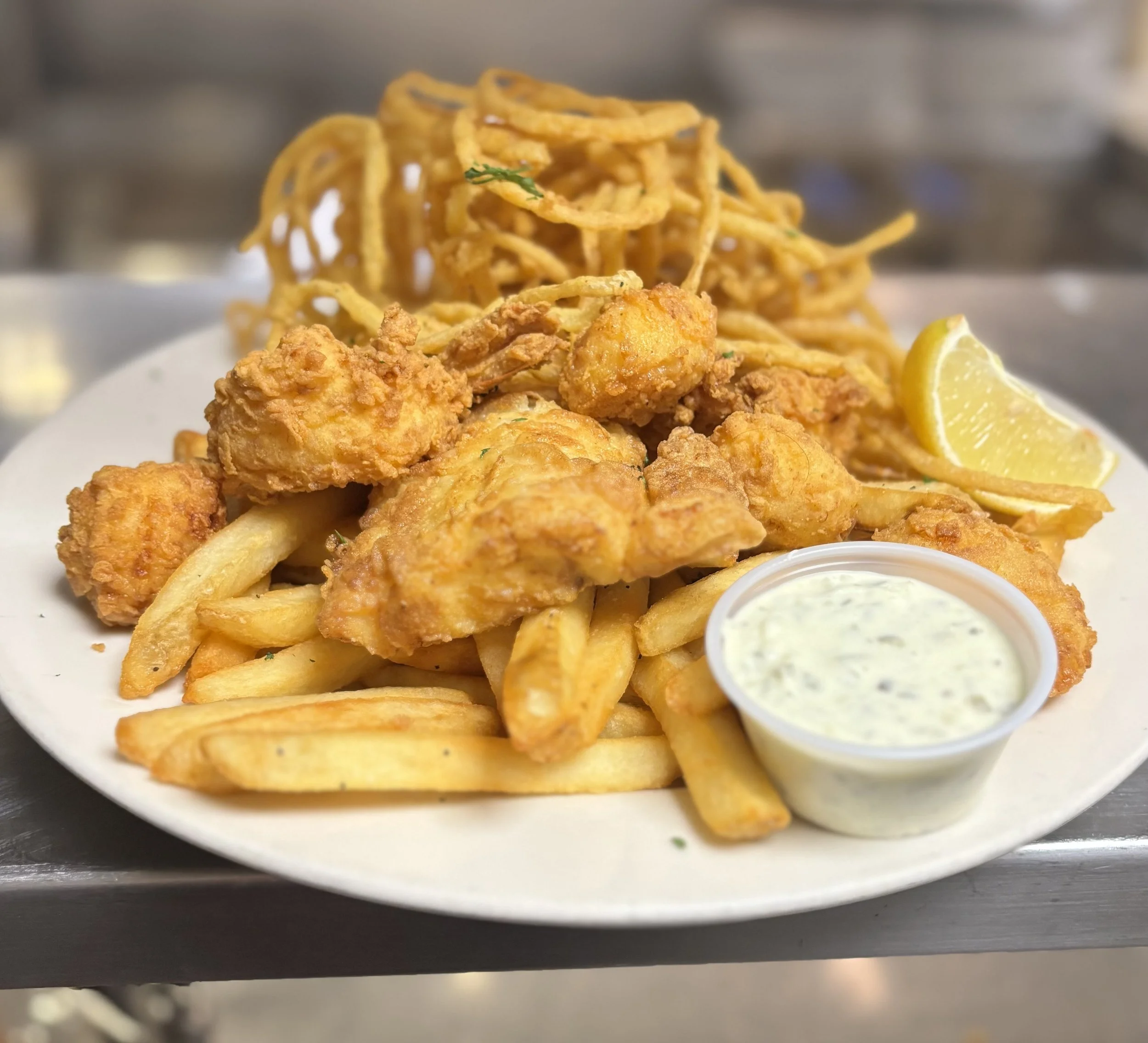 A classic combo platter of deep-fried haddock, scallops and shrimp. Served with our house fries and hand-breaded onion strings. $29